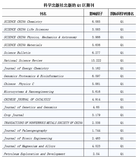 科学出版社出版的《中国科学》化学辑、生命科学辑、物理辑、材料科学辑、Science Bulletin,《国家科学评论》、《能源化学》等18种期刊均位于国际同领域期刊排名Q1区,占全国Q1区期刊总数(48种)的37.5%。