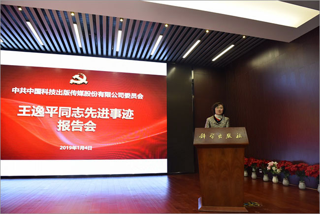 为贯彻落实院党组要求,2019年1月4日,中国科技出版传媒股份有限公司党委召开“学习王逸平同志先进事迹”报告会,邀请了王逸平生前所在上海药物所的所长助理、党委委员张翱作王逸平同志事迹报告,中国科传党委委员、社领导班子成员及在京的党员共260余人在现场聆听了报告,会议还进行了全网直播,中国科传京外分子公司党支部和部分院属单位共计500余人在网上全程收看了报告会现场直播。会议由党委副书记来豫蓉主持。