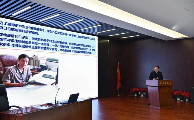 张翱同志作了题为《以身许家国毕生新药梦》的事迹报告,在一个多小时的时间里深情讲述了王逸平的先进事迹及其精神内涵与启示:“王逸平的世界里,有国家、有新药、有团队、有学生,唯独没有他自己”“干惊天动地事,做隐姓埋名人”“他没有留过洋、没有喝过洋墨水,没有任何人才“头衔”和“帽子”,但对王逸平而言,只要能寻找治疗疾病新药,为患者解除病痛,其他都可以放弃”。王逸平同志输给了病魔,却跑赢了人生。他用自己的一生,坚守着共产党员的高尚情怀,践行了共产党员的崇高誓言:执着科学、创新为民。建设医药强国、实现我国新药梦的宏伟目标赋予他战胜病魔的勇气。王逸平同志对新药事业的执着追求、与病魔顽强拼搏的精神、在平凡岗位上的不平凡、感人至深的事迹深深打动了所有参加学习的党员,很多人听得热泪盈眶;同时也激励了所有参加学习的党员,要以王逸平为楷模,深入学习他舍身忘我、服务人民的坚定信念,追求真理、严谨治学的科学精神,淡泊名利、奖掖后学的杰出品格。