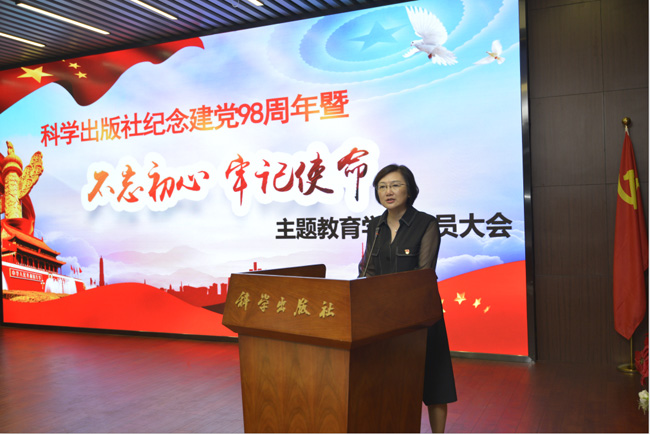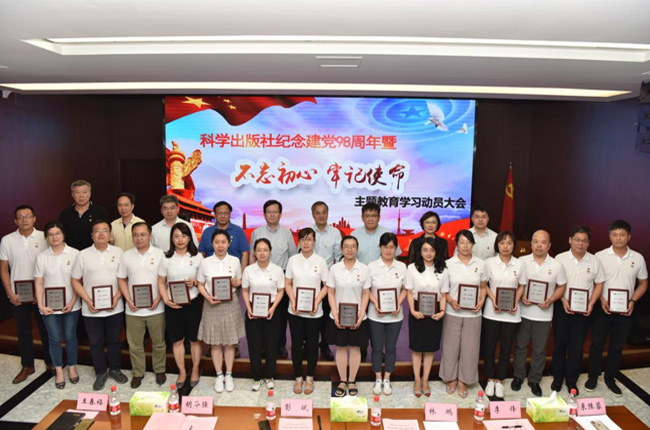 2019年7月1日,中国科技出版传媒股份有限公司隆重举行庆祝建党98周年暨“不忘初心、牢记使命”主题教育学习动员大会。回顾中国共产党艰苦创业的初心和使命,统一思想认识,明确目标任务,落实工作责任,总结2019年以来全社各项工作,表彰2018-2019年度优秀共产党员,并对“不忘初心、牢记使命”主题教育学习活动进行动员。股份公司全体党员参加会议,异地分子公司、党组织以视频形式收看会议直播,会议由党委副书记来豫蓉主持。