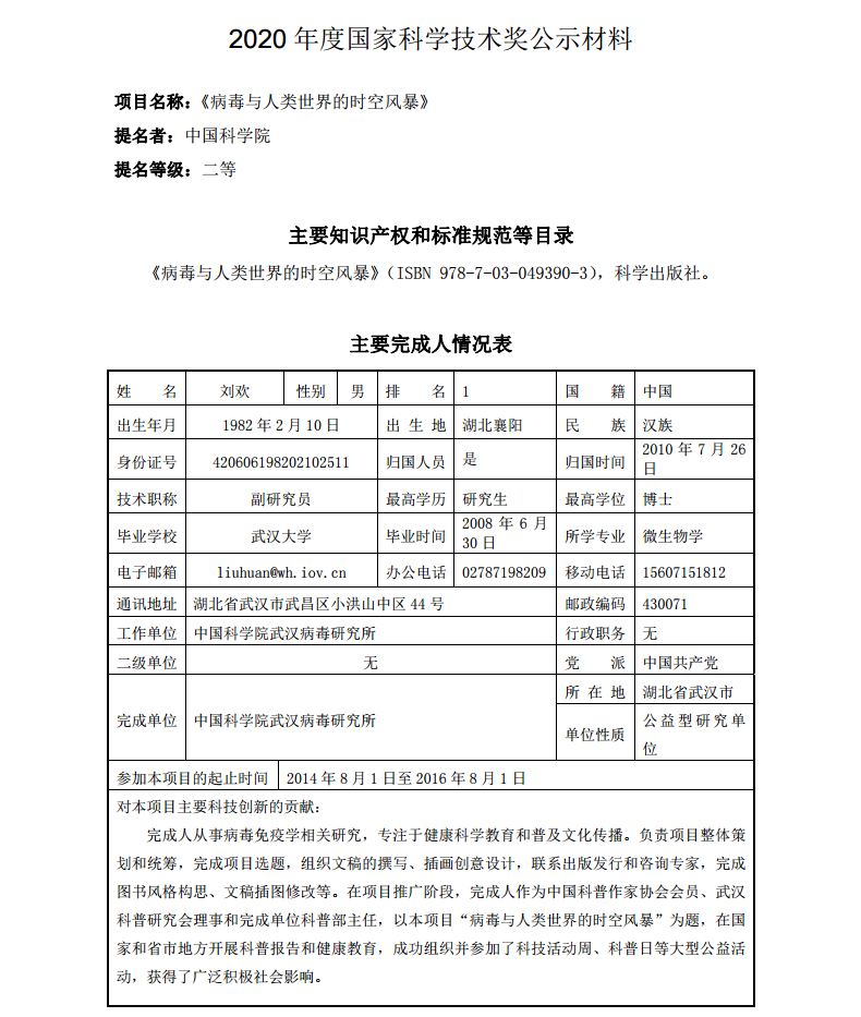 关于《病毒与人类的时空风暴》一书申报2020年国家科学技术奖的公示