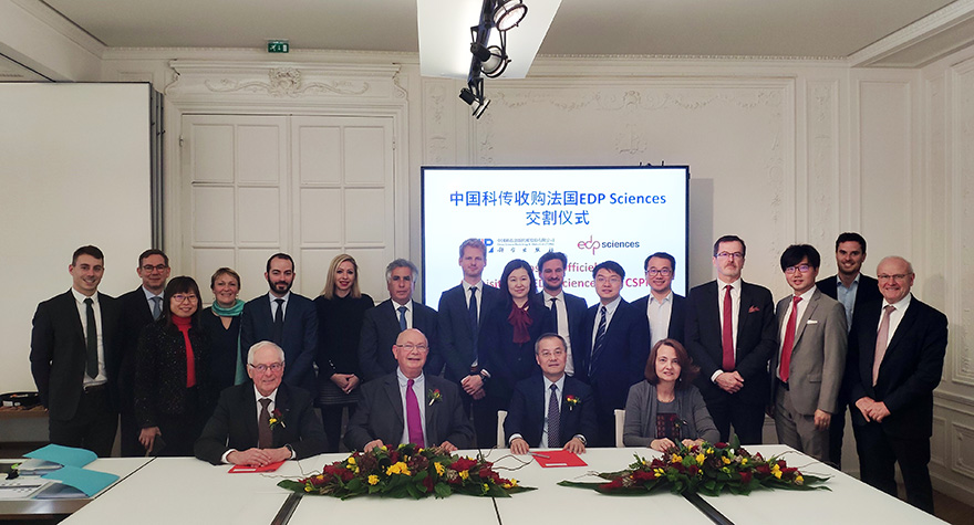 北京时间2019年11月13日,中国科技出版传媒股份有限公司(简称“中国科传”)与法国物理学会、法国化学学会、法国光学学会、法国应用数学与工业学会4家学会在法国巴黎举行了收购Edition Diffusion Press Sciences SA(简称“EDP Sciences”)100%股权的签约仪式。